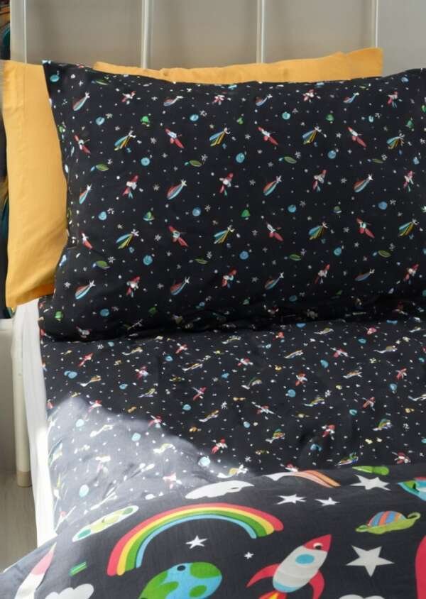 Wejdź do świata kolorów i przygód dziąki prześcieradłu Rainbow Rockets. Zawiera żywą mieszanką szybujących rakiet, tącz, planet i migoczących gwiazd na odważnym czarnym tle, ten arkusz jest idealny dla małych marzycieli i odkrywców kosmosu. Wykonane z łatwego w pielągnacji poliestru pochodzącego z recyklingu i miąkkiej bawełny, przeznaczone do codziennego użytku.