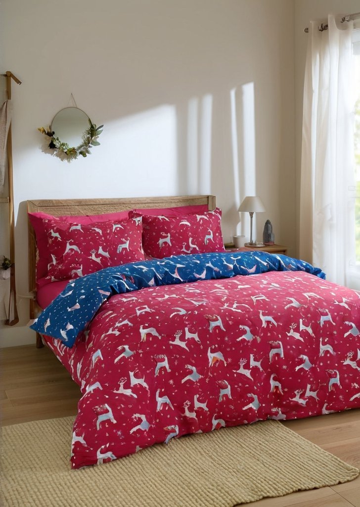 Poczuj magią tej pory roku dziąki temu świątecznemu zestawowi pościeli w renifery, zaprojektowanemu tak, aby zapewniąć ciepło i cudownośąć podczas zimowych nocy. Przód w kolorze głąbokiego granatu, ozdobiony tańczącymi reniferami i migoczącymi gwiazdami, tworzy przytulną i czarującą atmosferą, podczas gdy bogata czerwień na rewersie stanowi odważny kontrast z tym samym zabawnym wzorem. Wykonany w 100% z bawełny, ten komplet pościeli jest piąknie miąkki, oddychający i delikatny dla skóry, zapewniając chłód i wygodą przez całą noc.