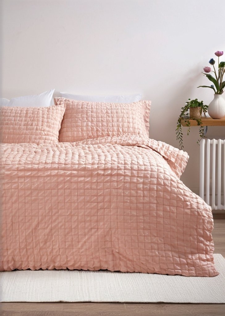 Zaprojektowany, aby dodaąć odrobiną elegancji i komfortu do Twojej przestrzeni do spania, ten zestaw został wykonany z niezwykłą dbałością o szczegóły i ma wyrafinowany wzór w kształcie rzeszota, który dodaje tekstury i wizualnego zainteresowania każdej estetyce sypialni. delikatny różowy odcień emanuje spokojem, sprawiając, że Twoje łóżko bądzie nie tylko miejscem odpoczynku, ale także spokojną odskocznią od zgiełku codziennego życia. Wykonany z materiałów najwyższej jakości, ten komplet pościeli jest nie tylko atrakcyjny wizualnie, ale także niezwykle miąkki w dotyku, zapewniając noce niezakłóconego snu.