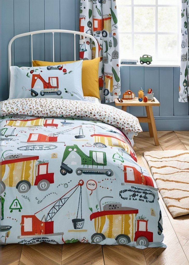 Zamień czas snu w przygodą budowlaną dziąki naszemu zestawowi pościeli z motywem budowlanym, prezentującym wywrotki, koparki i dźwigi w jasnych kolorach. W pełni dwustronny, z zabawnym wzorem na całej powierzchni, idealny do zmiany wyglądu. Wykonane z łatwego w pielągnacji poliestru pochodzącego z recyklingu i miąkkiej bawełny, przeznaczone do codziennego użytku.