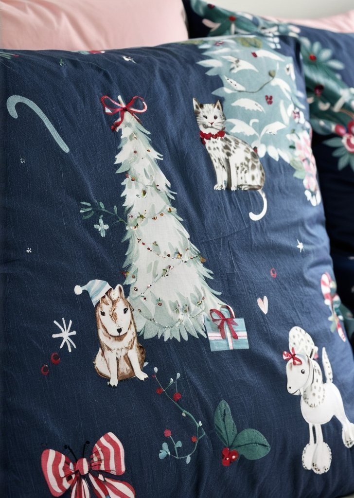 Przekształąć swoją sypialnią w świąteczne zimowe miejsce za pomocą zestawu dwustronnych poszewek na kołdrą w kształcie choinki w kolorze granatowym. Ten przytulny zestaw, zaprojektowany na bogatym granatowym tle, ozdobiony jest uroczymi choinkami, wesołymi cukierkowymi laskami, świątecznymi kokardkami i wesołymi pieskami, które wnoszą odrobiną fantazji do świątecznego wystroju. Dwustronna konstrukcja pozwala z łatwością zmieniaąć wygląd, tworząc dwa style w jednym, dopasowane do sezonowego nastroju. Miąkki, przytulny i łatwy w pielągnacji zestaw poszewek na kołdrą jest idealny, aby dodaąć ciepła i świątecznej radości Twoim nocom, niezależnie od tego, czy śpisz przed bożonarodzeniowym filmem, czy budzisz sią przed prezentami w bożonarodzeniowy poranek.