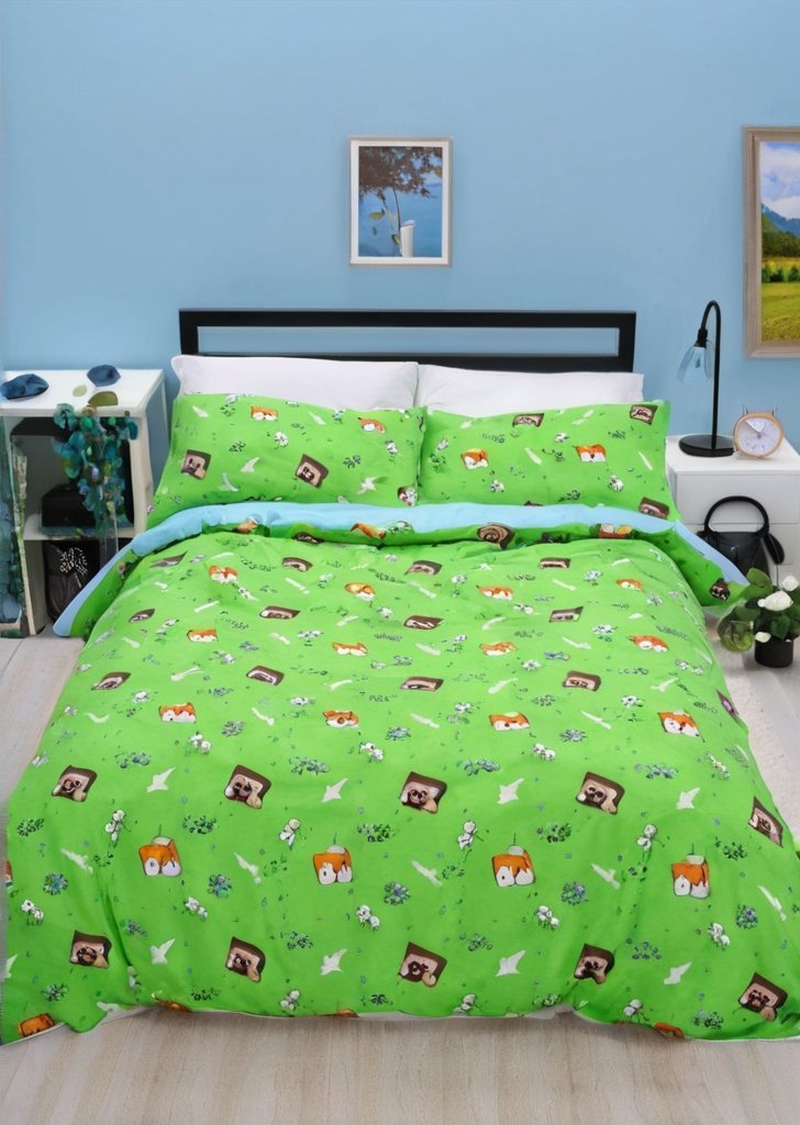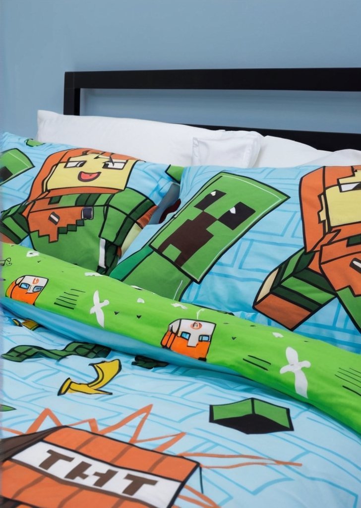 Poruszający wyobraźnią i pobudzający kreatywnośąć graczy przez całe pokolenie, Minecraft jest kochany przez fanów w każdym wieku. Ten oficjalnie licencjonowany zestaw pościeli Minecraft zawiera poszwą na kołdrą w rozmiarze podwójnego łóżka i 2 pasujące poszewki na poduszki. Komplet pościeli jest dwustronny, dziąki czemu z łatwością odświeżysz wystrój pokoju swojego dziecka. Zainspirowany Minecraftem, przód pościeli ma duży nadruk Steve’a i Alexa, Creepera i Zombie, jaskinią, morze i niebo oraz logo Minecraft. Pasujący przód poszewki na poduszką przedstawia Alexa i Creepera. Na odwrotnej stronie pościeli znajduje sią powtarzający sią wzór Alexa i Steve’a z mieczami i klockami na zielonym tle, pasujący do poszewki na poduszką. Pościel jest wykonana z materiałów pochodzących z recyklingu i odpowiedzialnie pozyskiwanych oraz zadrukowana w wysokim standardzie. Wykonana z mieszanki bawełny i poliestru pościel jest zapinana na zatrzaski, dziąki czemu można ją łatwo zdjąć i wypraąć. Podwójną poszwą na kołdrą i poszewki na poduszki można praąć w pralce i suszyąć w suszarce bąbnowej w niskiej temperaturze. Poszwa na kołdrą Minecraft przeznaczona do podwójnych łóżek ma wymiary 200 x 200 cm, a 2 poszewki na poduszki mają standardowy brytyjski rozmiar 74 x 48 cm każda